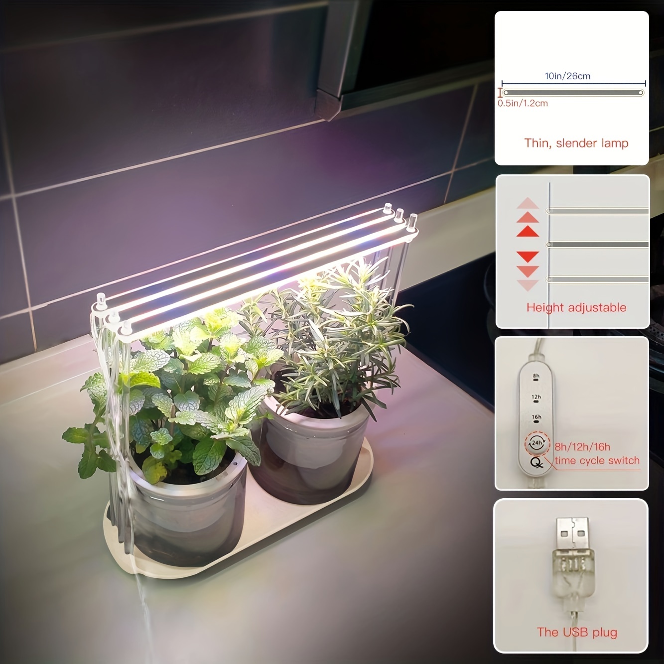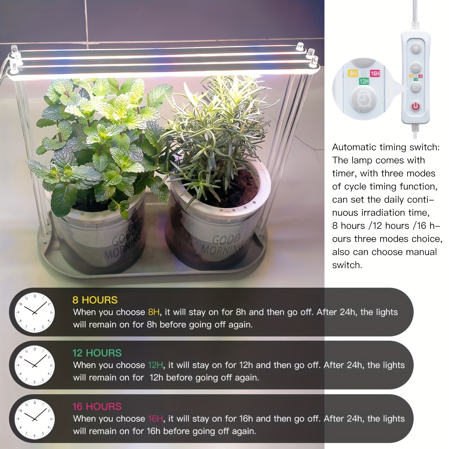 - Temporizador Integrado: Equipado com um temporizador prático, permitindo programar o tempo de iluminação para 2, 4 ou 8 horas, garantindo um ciclo de luz controlado e eficiente para suas plantas.